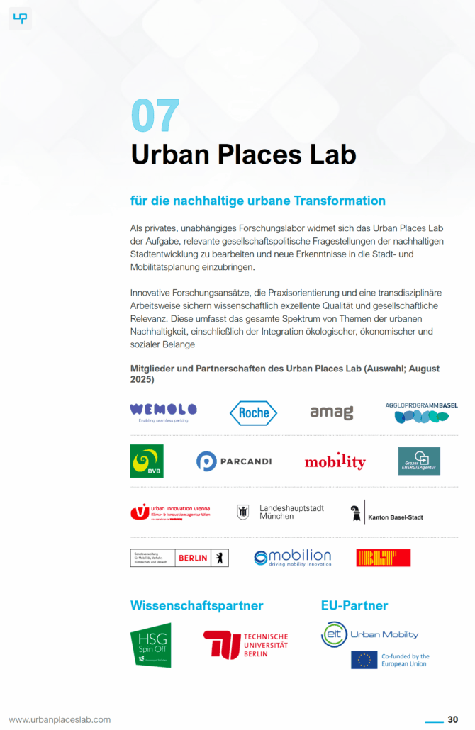 Das Urban Places Lab (UPL) ist ein unabhängiges Forschungslabor und die Plattform zur Umsetzung von Mobilitätsprojekten mit wissenschaftlicher Begleitung. Durch transdisziplinäre Ansätze verbinden wir wissenschaftliche Exzellenz mit praktischer Umsetzung. Im Mittelpunkt stehen unserer Projekte: von automatisierten Fahren über die Entwicklung von Mobility Hubs und die Transformation von Parkgaragen bis hin zu Lösungen für Mitarbeitermobilität. Damit schaffen wir praxisnahe Lösungen, die Städte effizienter, lebenswerter und nachhaltiger machen. Das Lab ist ein Spin-off der Universität St. Gallen und arbeitet eng mit Universitäten in Deutschland, Österreich und der Schweiz zusammen.